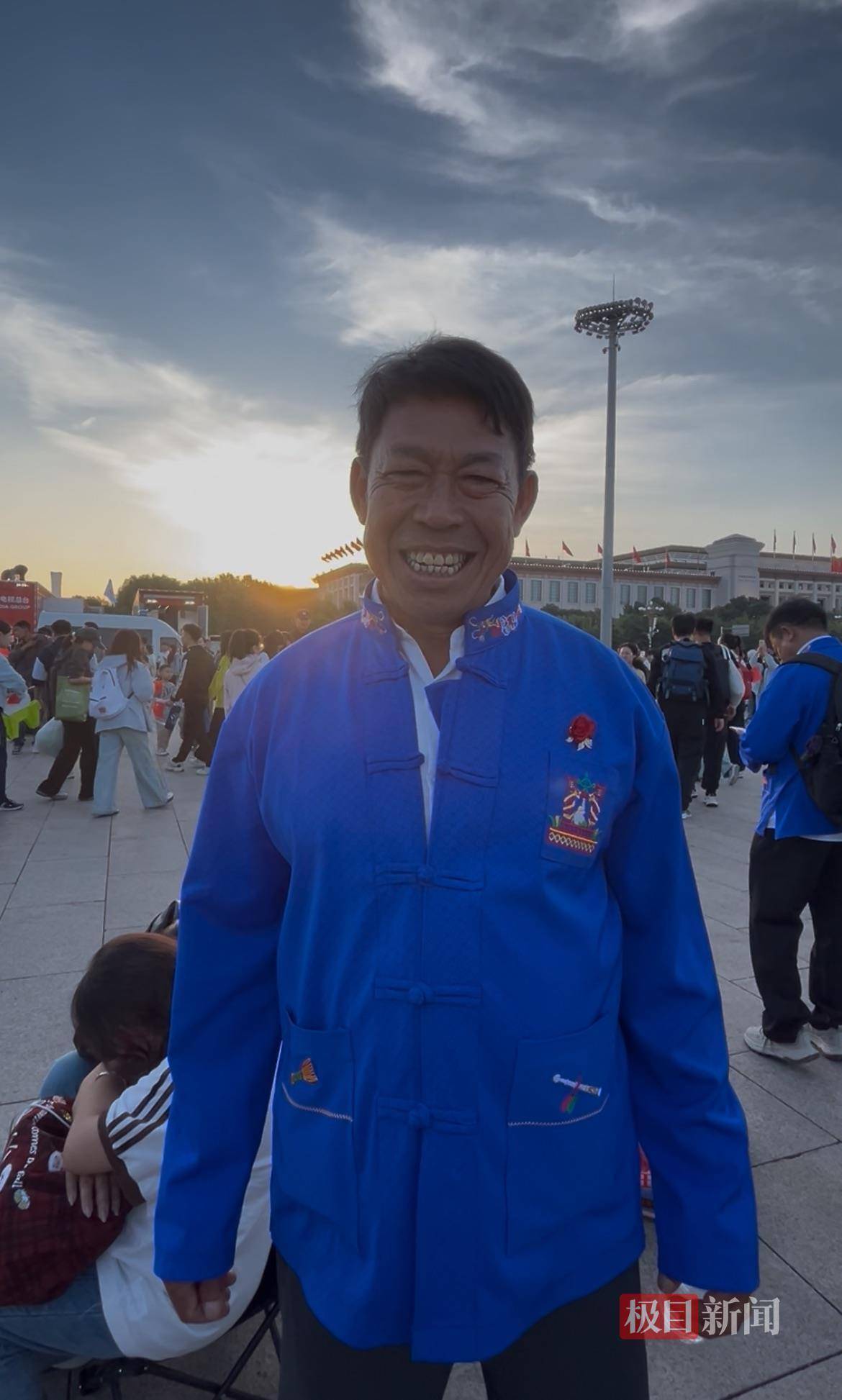 “我们是来自云南的阿昌族,现在穿的蓝色上衣是我们阿昌族在节日庆典时才会穿的少数民族服饰,也是特意穿上的。”景四发介绍道,他今年68岁,此次在侄女的陪伴下,与兄弟、弟媳等一行8人来到北京。这是他第一次来到北京,为了赶上国庆的升旗仪式,他们提前几天就到了。